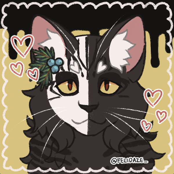 Another thing that Juniperpaw's clanmates know about her is that she loves love. One of her favorite pastimes is gossiping about real or potential romances, and asking couples when they'll have their litters (she needs to know when to keep her schedule clear for kitsitting!) Juniper herself wants to have many kits with the love of her life someday, whoever that may be. Though she has the best of intentions, she tends to be more than a little nosy and fancies herself a matchmaker. Tell her off about it and she'll say she just wants the best for you!